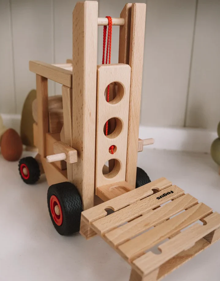 A wonderful working forklift by Fagus, with three peg figures and a box to lift and load. The back wheels turn to direct the fork lift on its way.